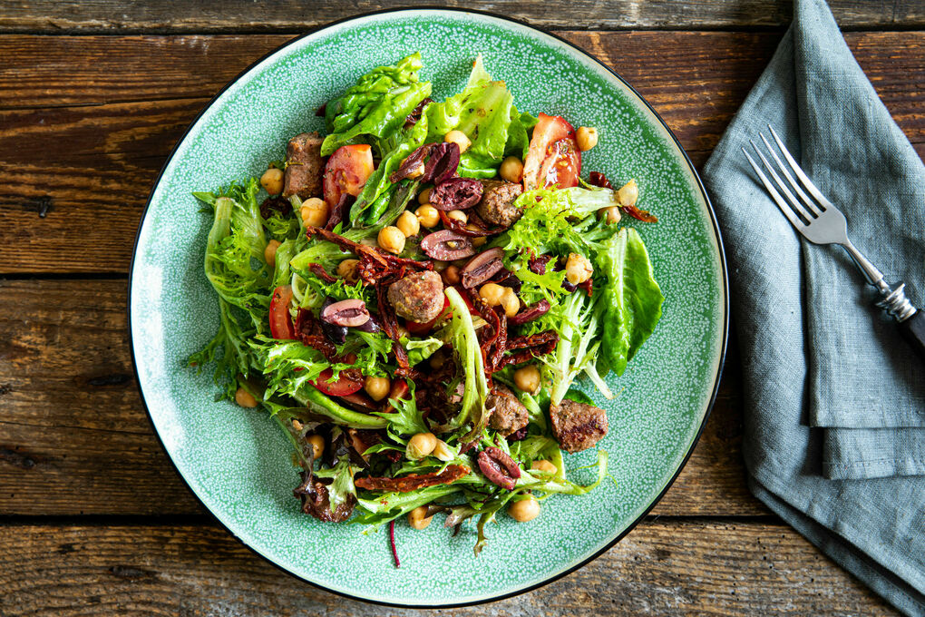 Low Carb Salat Mit Deftiger Rindswurst Mediterrane Art Mit Kichererbsen Und Oliven Marley Spoon